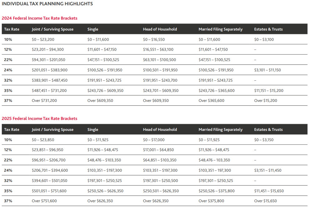With rising interest rates, inflation, and continuing market volatility, tax planning is as essential as ever for taxpayers looking to manage cash flow while paying the least amount of taxes possible over time. As we approach the end of the year, now is the time for individuals, business owners, and family offices to review their 2024 and 2025 tax situations and identify opportunities for reducing, deferring, or accelerating their tax obligations. The information contained in this guide is based on federal laws and policies in effect as of the publication date. This guide discusses tax planning for U.S. federal income taxes. Applicable state and foreign taxes should also be considered. Taxpayers should consult with a trusted advisor when making tax and financial decisions regarding any of the following items.